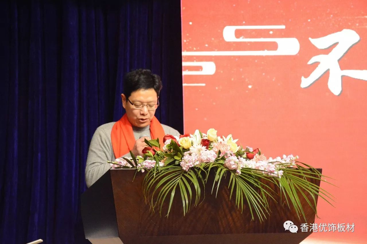 优饰板材总经理:赵玉祥上台致辞,“首先感谢长期以来所有关心、关注、支持公司发展的各级领导、供应商、经销商、业内同仁和亲朋好友;感谢公司全体员工多年来的一路相伴和辛勤付出;